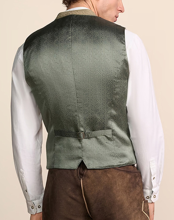 Die Herrenweste „Alessio“ von Krüger in edlem Schilfgrün bringt klassische Trachtenoptik mit feinen Details zusammen. Der bestickte Stehkragen und die silberfarbenen Kugelknöpfe setzen stilvolle Akzente, während das Ton-in-Ton Design angenehm ruhig wirkt. Drei praktische Taschen bieten Platz für kleine Essentials, das dekorative Einstecktuch rundet den Look charmant ab. Der Rücken ist aus dunkelgrünem gemusterten Satinstoff. Dank verstellbarem Riegel am Rücken sitzt die Weste immer perfekt – ideal für festliche Anlässe und besondere Momente.