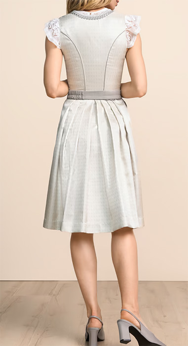Das Dirndl „Nieves“ von Krüger besticht durch seine elegante Farbkombination in Beige-Grau und ein fein durchgängiges Ornamentmuster. Das Mieder mit geradem Ausschnitt wird von auffälligen Borten eingerahmt und mit einem verdeckten Reißverschluss geschlossen. Die hell glänzende Satinschnürung verläuft durch außergewöhnliche, quadratische Miederhaken mit reich verziertem Design. Eine schlichte graue Schürze mit passender Schnalle, geformt wie die Miederhaken, rundet das edle Gesamtbild ab. Der 60 cm lange Rock verfügt über zwei praktische Eingrifftaschen. Ideal für stilvolle Auftritte zu besonderen Anlässen in hochwertiger Trachtenmode.