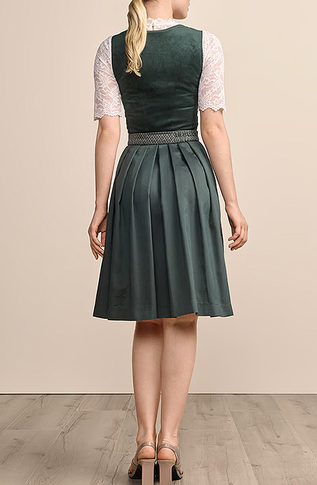 Das Midi-Dirndl „Alisha“ in dunkelgrün/petrol von Krüger wirkt edel und gleichzeitig angenehm modern. Das weiche Samtmieder mit Balkonettausschnitt und feiner Kordelbordüre setzt das Dekolleté stilvoll in Szene. Die gemusterte Schürze mit reich verzierter Schnalle in Vintagegold bringt Bewegung ins Design und sorgt für das gewisse Etwas. Ein Look, der sofort ins Auge fällt und sich vielseitig kombinieren lässt.