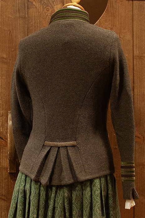 Die Damenstrickjacke „Maria“ von Litzlfelder verbindet warmes Mittelbraun, liebevolle Details und dieses angenehme Gefühl, wenn man etwas anzieht, das sofort passt. Der verzierte Samtstehkragen mit seinen grünen, braunen und roten Borten zieht die Blicke auf sich, und ein Kunde erzählte einmal, wie sehr ihm genau dieses Detail gefallen hat. Das glitzernde Knopfdetail verleiht der Jacke etwas Besonderes, ohne aufdringlich zu wirken. Dazu kommen das dekorative Schoßerl mit Samtriegel und die samtigen Paspeln an den Taschen. All das macht „Maria“ zu einer Jacke, die lässig, charmant und wunderbar vielseitig tragbar ist.