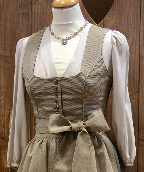 Das Wenger Midi-Dirndl „Ilva“ für Damen präsentiert sich in eleganter sandfarbener Ausführung mit liebevollen Details und hochwertiger Verarbeitung. Das Mieder in zartem Sandton ist mit feinen Pünktchen versehen, der gerade Ausschnitt wird von zierlichen Paspelborten umrahmt. Hübsche Blumenknöpfe zieren die Knopfleiste und verleihen dem Modell eine traditionelle Note. Der Rock im dunkleren Sandton ist ebenfalls gepunktet und im unteren Drittel mit gestreiften Musterborten in Häkeloptik sowie einer dekorativen Wellenborte am Saum geschmückt. Die schlichte sandfarbene Schürze rundet das Gesamtbild stilvoll ab und macht das Dirndl zum idealen Begleiter für Wiesn, Feste und feierliche Anlässe.