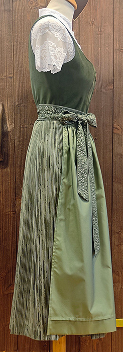 Das Wenger Midi-Dirndl „Ira“ für Damen begeistert mit einer eleganten Kombination aus traditioneller Form und modernem Design. Das dunkelgrüne Mieder aus edlem Feincord ist mit einem herzförmigen Ausschnitt versehen, der von feinen Paspelborten geschmackvoll eingefasst wird. Ein verdeckter Reißverschluss an der Vorderseite sorgt für eine besonders elegante Optik und hohen Tragekomfort. Der helle Rock zeigt ein abwechslungsreiches Streifenmuster in verschiedenen Grüntönen und verleiht dem Outfit Lebendigkeit und Tiefe. Die schlichte, leicht glänzende hellgrüne Schürze wird durch ein auffällig gemustertes Schürzenband in sattem Grün stilvoll ergänzt. Dieses Band setzt einen charmanten Akzent und macht das Dirndl zu einem modischen Blickfang auf dem Oktoberfest, bei Hochzeiten oder feierlichen Anlässen.